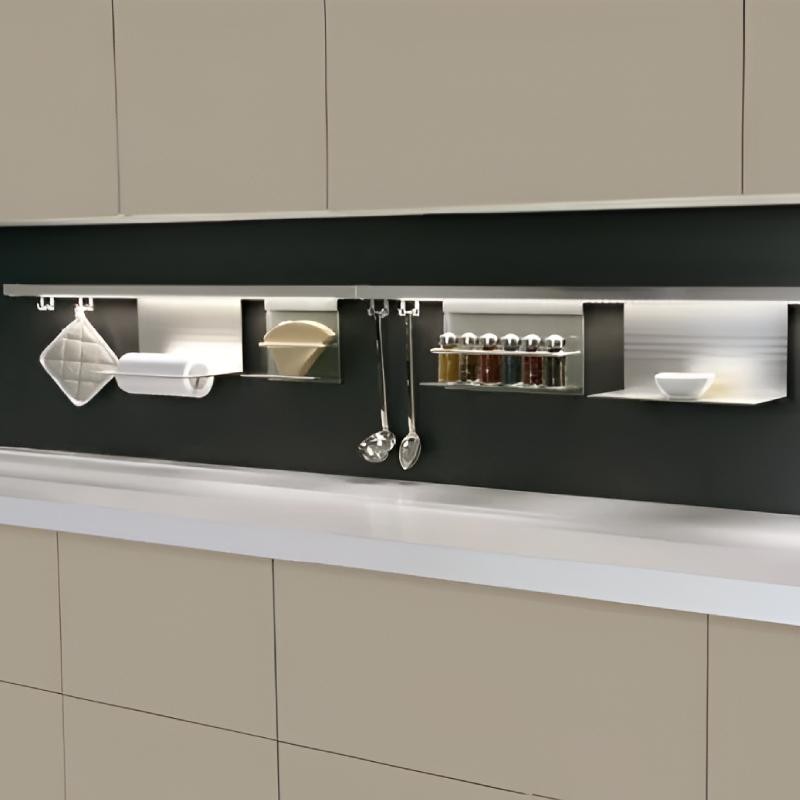 A prateleira em alumínio é um acessório prático e elegante projetado para integrar-se ao sistema Linero Modern. Esta prateleira permite manter especiarias ou pequenos utensílios organizados, otimizando o espaço sobre a bancada.