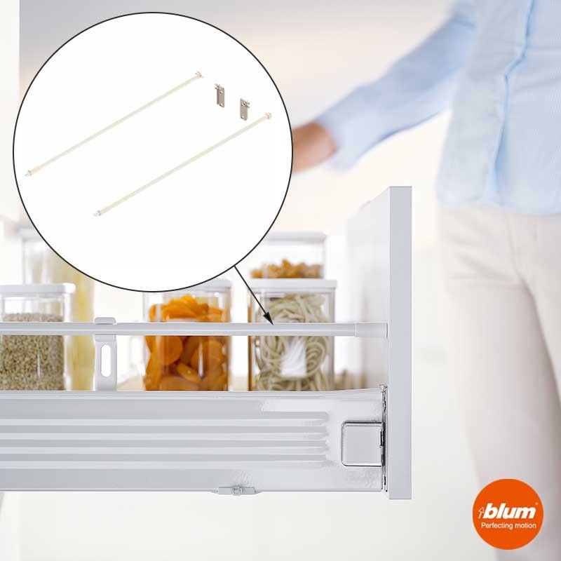 Barres latérales longitudinales rondes avec adaptateur pour l'arrière des tiroirs Blum Metabox M de hauteur 86 mm et 50 cm de profondeur. Contenu: 2 pcs.