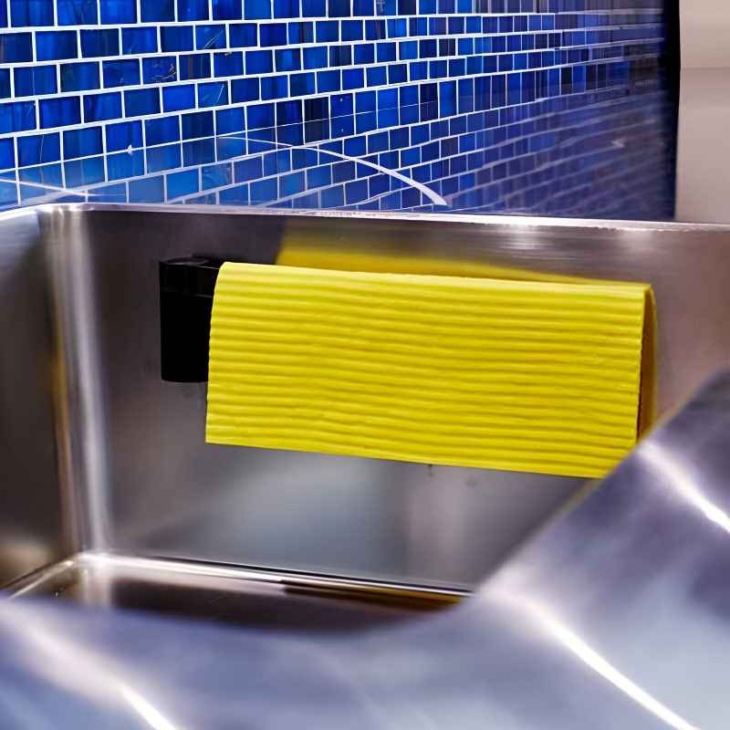 Il possède un aimant à l’arrière pour le fixer à l’évier (il est indispensable d’utiliser l’adhésif fourni pour une fixation parfaite de l’aimant).