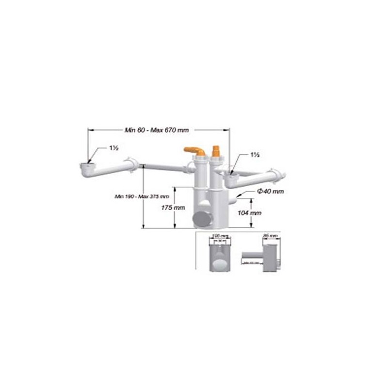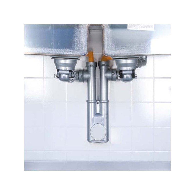 Siphon à 2 voies pour le drain de l'évier qui permet d'optimiser l'espace pour tirer parti de la capacité maximale de l'armoire évier. Couleur: gris.
