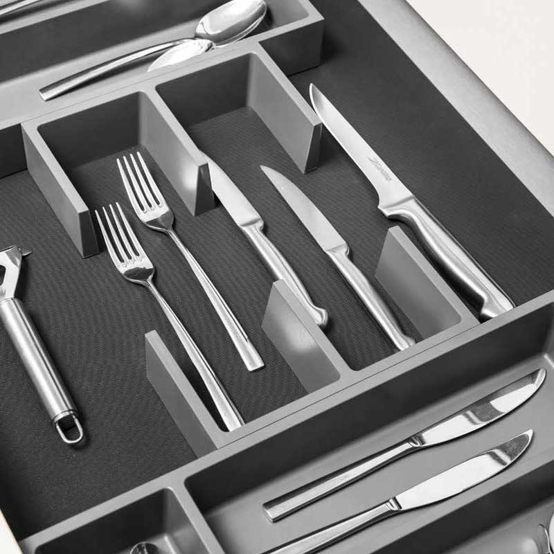 Le système Connect est une solution modulaire hautement flexible conçue pour s’adapter à tout tiroir de cuisine. Ses éléments en polystyrène de couleur anthracite se connectent entre eux au moyen d’un système stable et composable, permettant de créer des configurations entièrement personnalisées. Le système ne dépend pas des côtés du tiroir, garantissant une compatibilité avec toute largeur ou profondeur. Ce set Connect 5 est prévu pour des tiroirs de 700 à 1200 mm, offrant une organisation moderne, ajustable et compatible avec tous les systèmes de coulisses du marché.