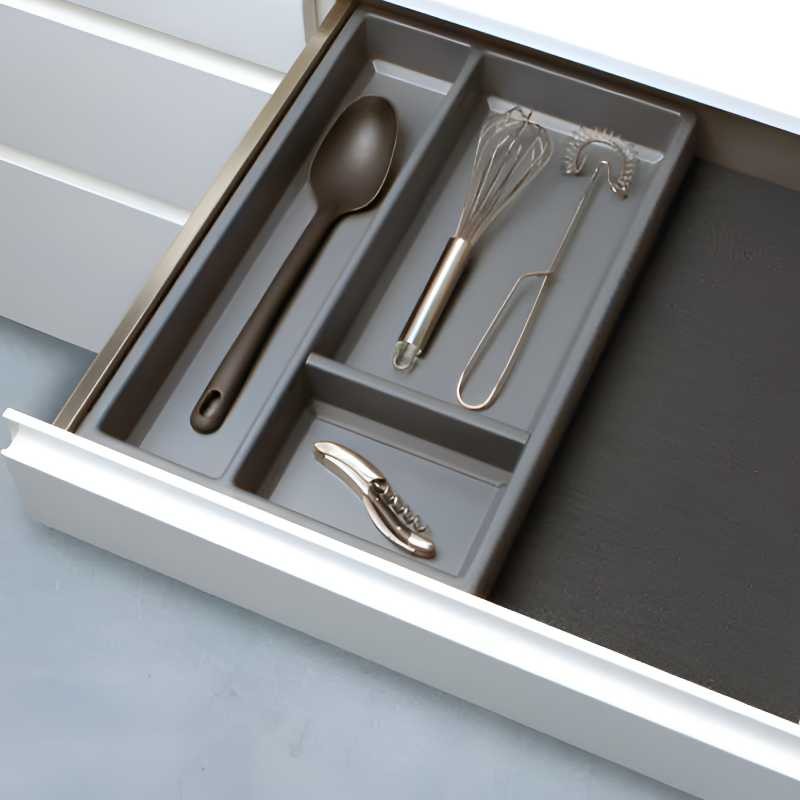 La famille Island de Cucine Oggi démontre comment trois pièces indépendantes —range‑couverts, range‑épices et range‑ustensiles— peuvent transformer l’organisation intérieure du tiroir avec une esthétique élégante et un prix très économique. Fabriquées en polypropylène gris anthracite et dotées de côtés fermés, chaque pièce mesure 300 mm de largeur et peut être achetée séparément selon les besoins du client. En accessoire supplémentaire, un tapis rigide antidérapant de couleur noire est proposé (non inclus), apportant une finition plus uniforme et sophistiquée.