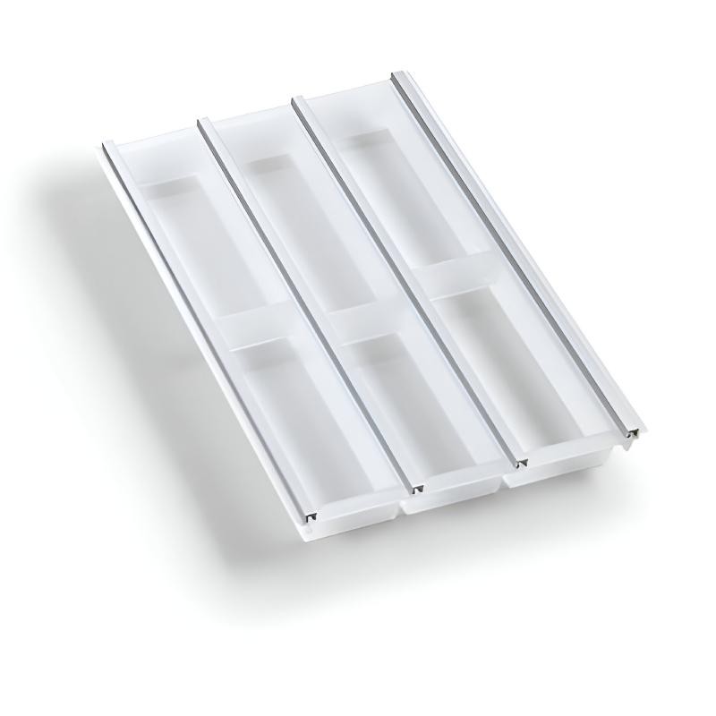 Nous présentons les équipements de tiroir du Fusion System. Ces range‑couverts sont conçus pour remplir entièrement la largeur du tiroir grâce à des bacs en plastique, sans besoin de tapis antidérapants. Le Set 2 est prévu pour des tiroirs de 400 mm et offre une organisation moderne, pratique et totalement intégrée grâce à la combinaison de bacs modulaires, de tiges et d’embouts flexibles. Disponible en plusieurs finitions transparentes, il apporte une esthétique contemporaine et une excellente fonctionnalité.