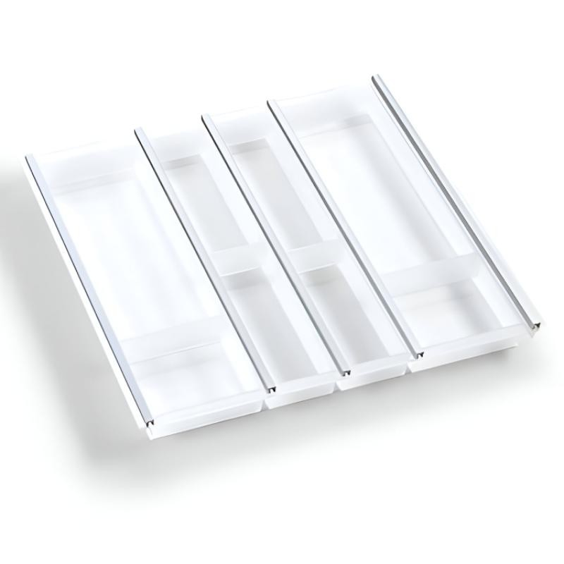 Nous présentons les équipements de tiroir du Fusion System. Ces range‑couverts sont conçus pour remplir entièrement la largeur du tiroir grâce à des bacs en plastique, sans besoin de tapis antidérapants. Le Set 5 est prévu pour des tiroirs de 600 mm et offre une organisation moderne, pratique et totalement intégrée grâce à la combinaison de bacs modulaires, de tiges et d’embouts flexibles. Disponible en plusieurs finitions transparentes, il apporte une esthétique contemporaine et une excellente fonctionnalité.