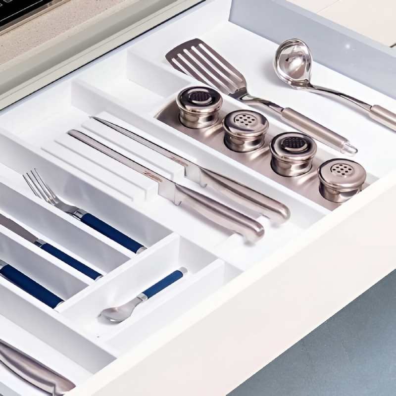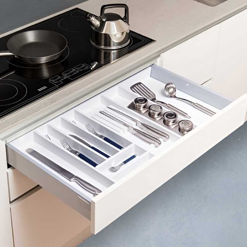 Ce range‑couteaux de Cucine Oggi transforme l’intérieur du tiroir en un espace plus sûr et organisé. Son design minimaliste en blanc mat s’adapte à toute cuisine moderne, tandis que son revêtement antibactérien et sa structure en MDF hydrofuge assurent une protection durable et un entretien simple. Idéal pour maintenir chaque couteau à sa place.