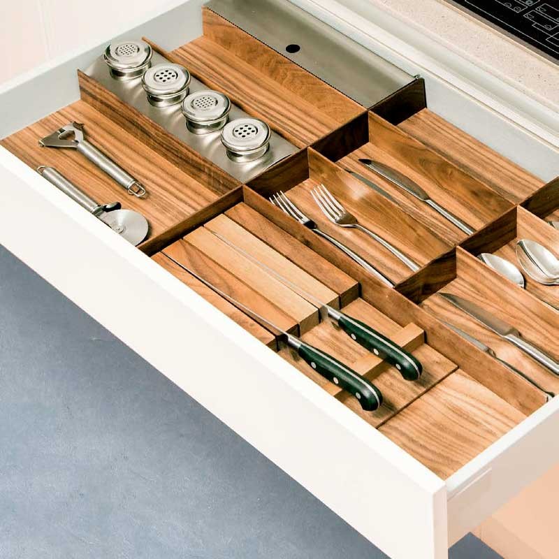 Optimisez l’espace de vos tiroirs avec la rallonge en bois en forme de L pour range-couverts Cucine Oggi. Cette pièce se place à l’arrière du range-couverts, comblant l’espace libre dans les tiroirs profonds et permettant aux range-couverts standard de s’adapter parfaitement à des tiroirs jusqu’à 650 mm de profondeur.