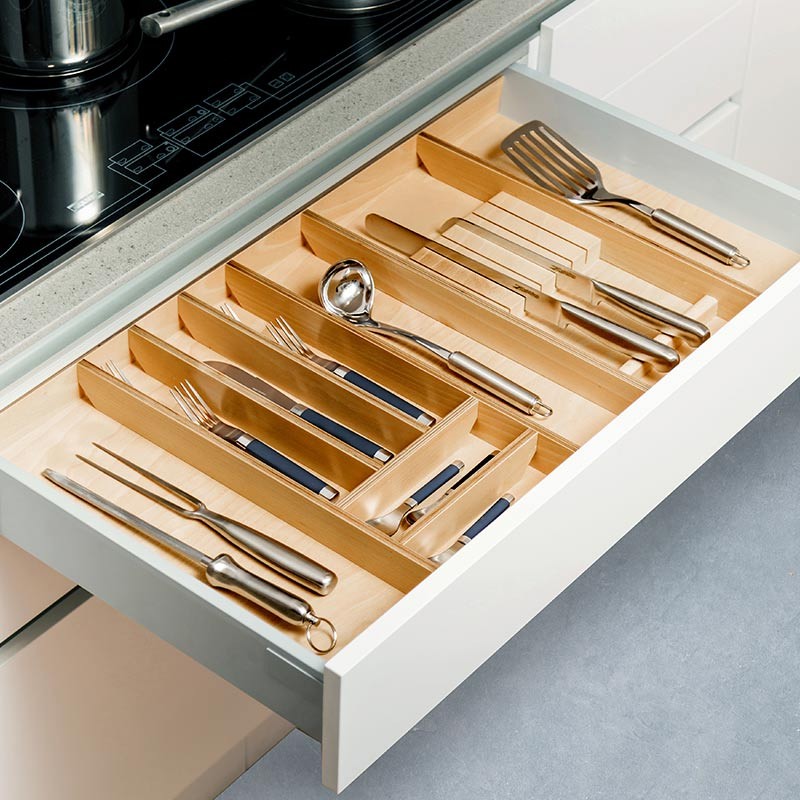 Les range‑couverts marins constituent une famille d’intérieurs de tiroir classiques et intemporels. Fabriqués en panneau marin phénolique plaqué hêtre, ils se distinguent par leur grande élégance et par leur design sans côté, ce qui leur permet de s’intégrer complètement dans le tiroir de cuisine. Leur esthétique chaleureuse et naturelle, associée à leur résistance, en fait une option idéale pour ceux qui recherchent un range‑couverts durable et élégant pour des tiroirs de 300 mm.