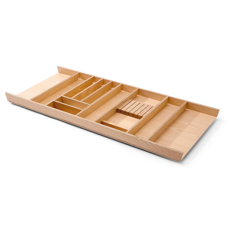 Les range‑couverts en bois marins constituent une famille d’intérieurs de tiroir classiques et intemporels. Fabriqués en panneau marin phénolique plaqué hêtre, ils se distinguent par leur grande élégance et par leur design sans côté, ce qui leur permet de s’intégrer complètement dans le tiroir de cuisine. Ce modèle pour tiroirs de 1200 mm intègre un porte‑couteaux et offre un rangement large, élégant et très résistant, idéal pour ceux qui recherchent un range‑couverts de grande capacité.