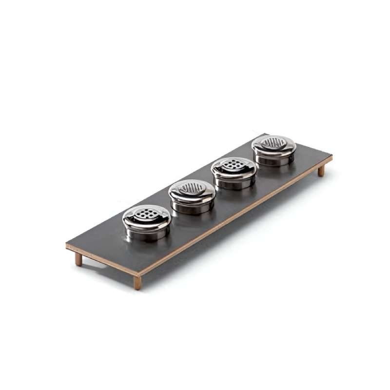 Accessoire porte‑épices avec 4 pots en acier inox inclus, à installer dans le logement A des range‑couverts marins de 600, 900 et 1200 mm.