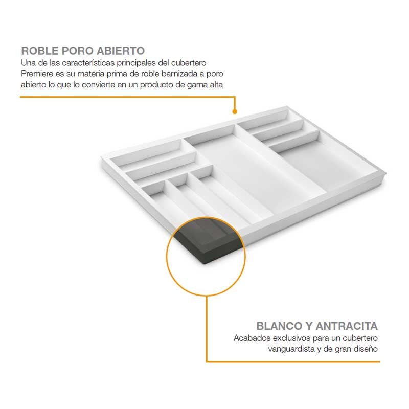 Porte-couverts en bois modèle Premiere pour un tiroir de la cuisine. Disponible en blanc ou anthracite, et pour les différentes mesures de la pièce de mobilier.