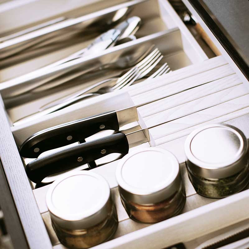Porte-couteaux de bois pour porte-couverts de cuisine modèle Premiere. Disponible en blanc ou anthracite. Dimensions: 110 x 423 x 38 mm.