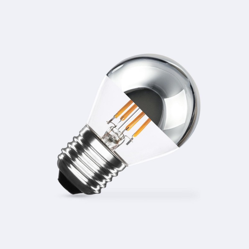 L'ampoule filament LED E27 4W 400 lm G45 Chrome Reflect offre une alternative moderne et efficace pour remplacer les ampoules traditionnelles de 60W, tout en conservant le charme rétro si apprécié. Grâce à sa large distribution de lumière de 300º, cette ampoule assure un éclairage uniforme dans n'importe quel environnement, se distinguant par sa qualité supérieure et son design en verre avec filaments.