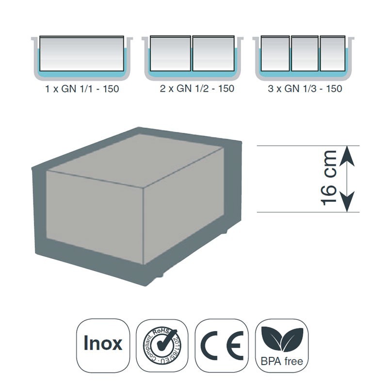 Son réservoir a une capacité de 24 litres et d'une hauteur de 16 cm qui est entièrement compatible pour l'utilisation des mesures suivantes de bassins Grastronorm: