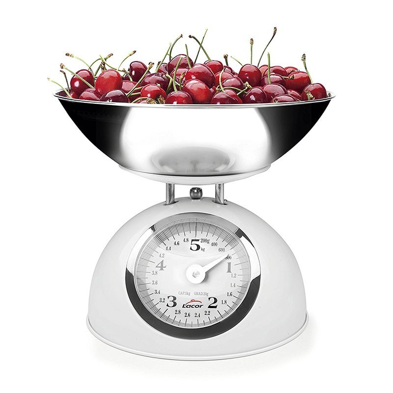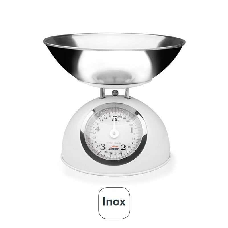 À l'échelle de la mécanique Rétro Blanc avec un bol de 24 cm de diamètre et de 2 L capacité en acier inoxydable de haute qualité et de la résistance à la corrosion. Tara: 5kg. Division: 20g.