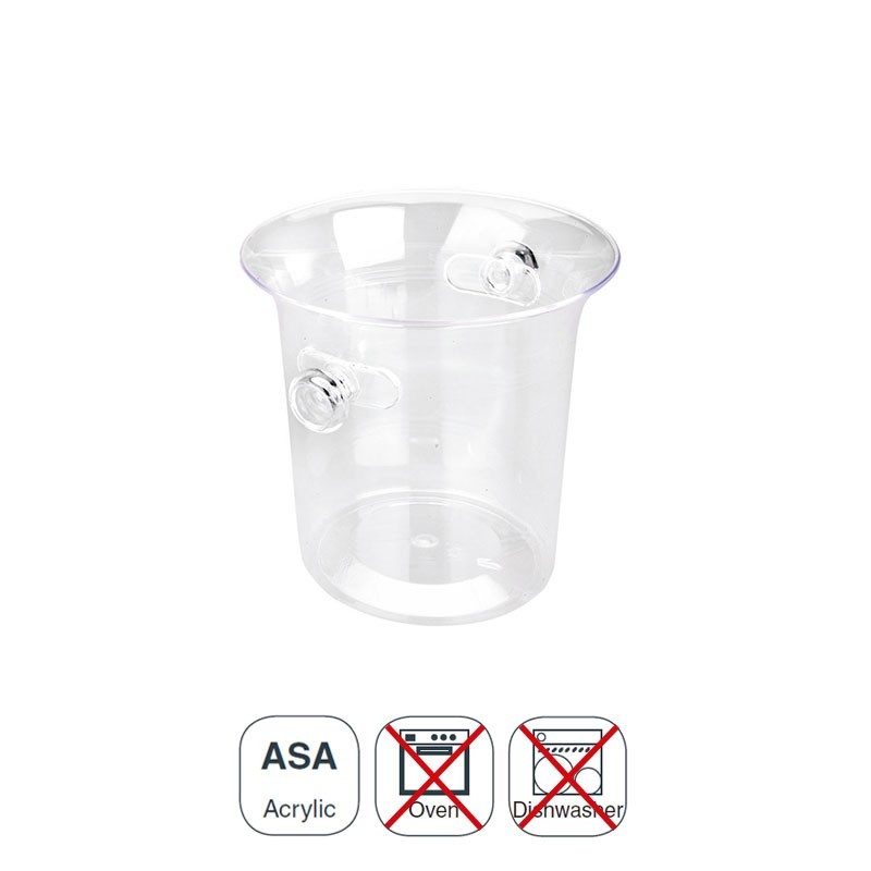 Seau à mettre de la glace et de refroidir des bouteilles en acrylique clair. Incorporer les brides latérales et poignées rondes sur le grand modèle. Disponible en 2 tailles.