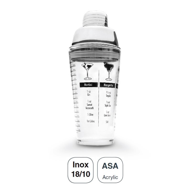 Shaker à Cocktail en plastique-acrylique, transparent de 0,45 litres de capacité et 9x22,5 cm avec couvercle en acier inoxydable 18/10 de haute qualité et résistance.