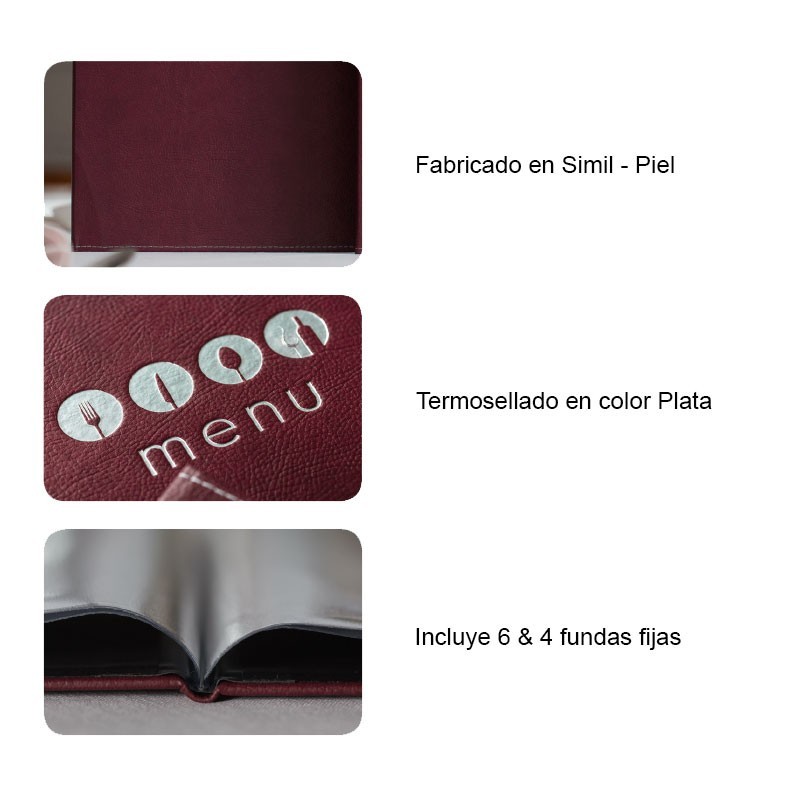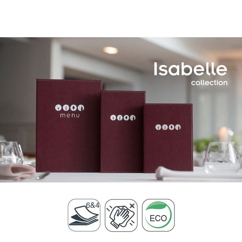 Portamenús collection Isabelle fabriqué en imitation cuir avec sceau de chaleur dans la couleur argentée et couvre fixe PVC. Idéal pour l'hôtellerie et la restauration. La taille à choisir.