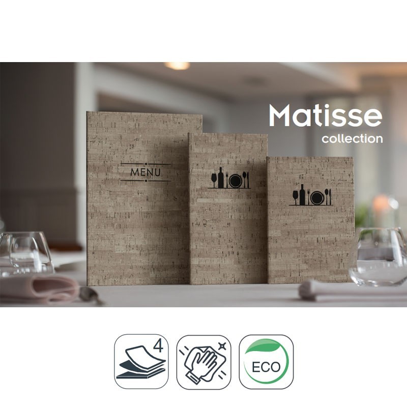 Portamenús collection Matisse produit en imitation cuir avec sceau de chaleur en couleur noir et les manches fixe à partir de PVC. Idéal pour l'hôtellerie et la restauration. La taille à choisir.