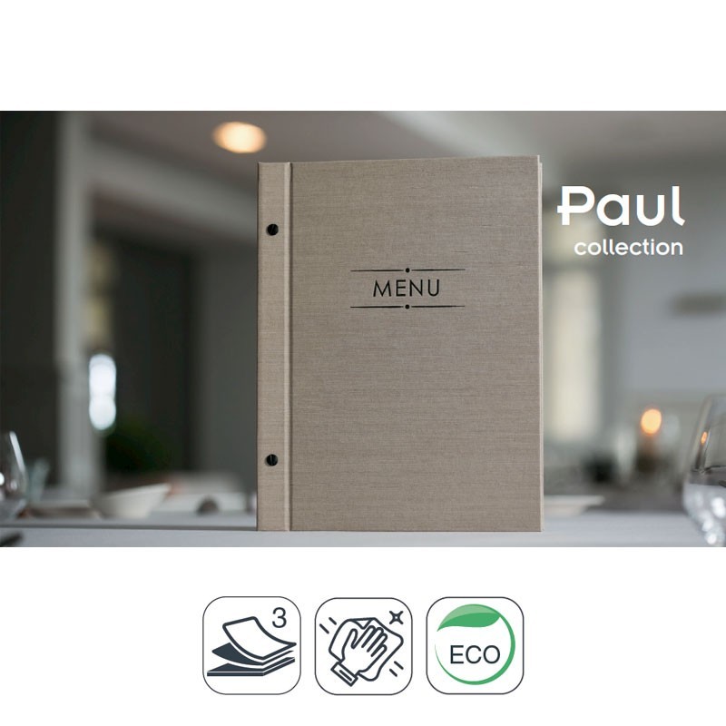 Portamenús collection Paul fait dans Telflex avec sceau de chaleur en couleur noir et les manches de PVC avec vissée extérieur. Idéal pour l'hôtellerie et la restauration. A4 taille: 25,5x32 cm