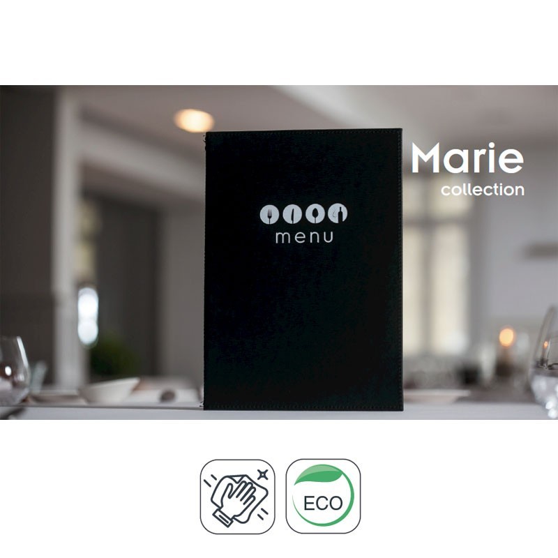 Portamenús collection Marie fabriqué en imitation cuir, souple, à la chaleur d'étanchéité, de couleur blanche, et les volets en position fixe sur le couvercle. Idéal pour l'hôtellerie et la restauration. A4 taille: 23x32 cm