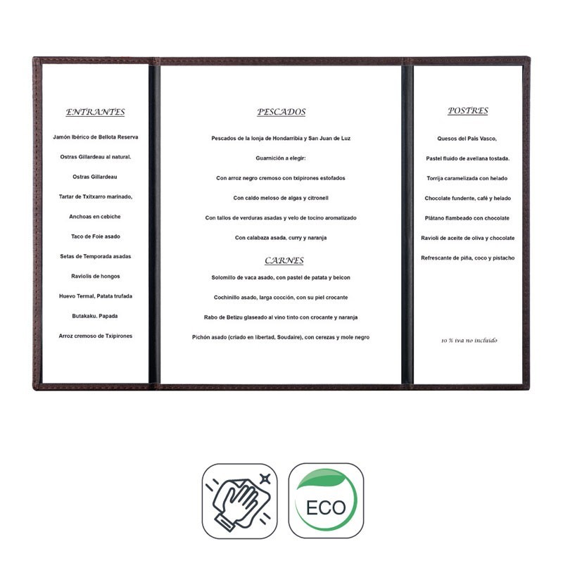Portamenús collection Leo fabriqué en similicuir avec la chaleur d'étanchéité dans une couleur crème et 3 rabats clair. Idéal pour l'hôtellerie et la restauration. A4 taille: 23x32 cm