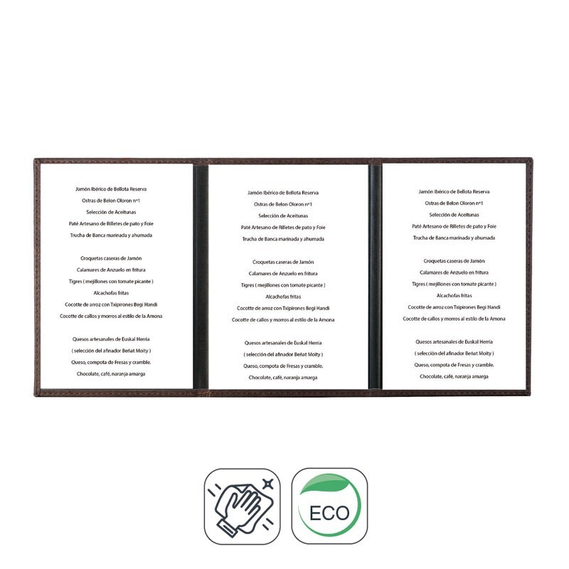 Portamenús collection Titien fabriqué en similicuir avec la chaleur d'étanchéité dans une couleur crème et 3 rabats clair. Idéal pour l'hôtellerie et la restauration. Format A5: 17x24 cm