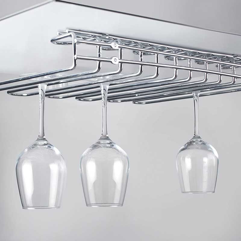 Support à coupes en acier chromé qui permet un gain de place et un rangement des verres à pied de façon ordonnée.