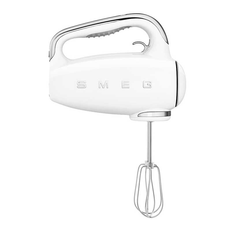 Mixeur électrique Smeg 50's Style finition blanche avec 250 W de puissance, 9 niveaux de vitesse et fonction turbo.