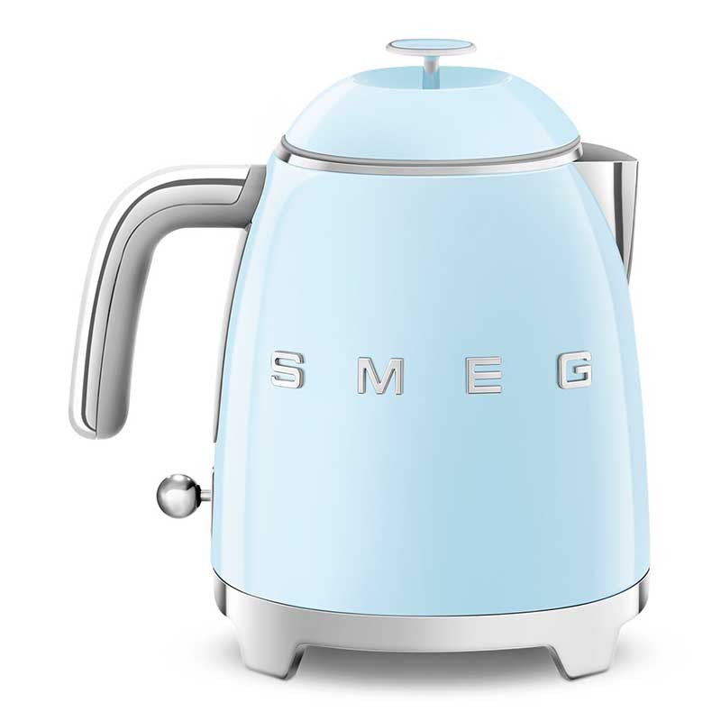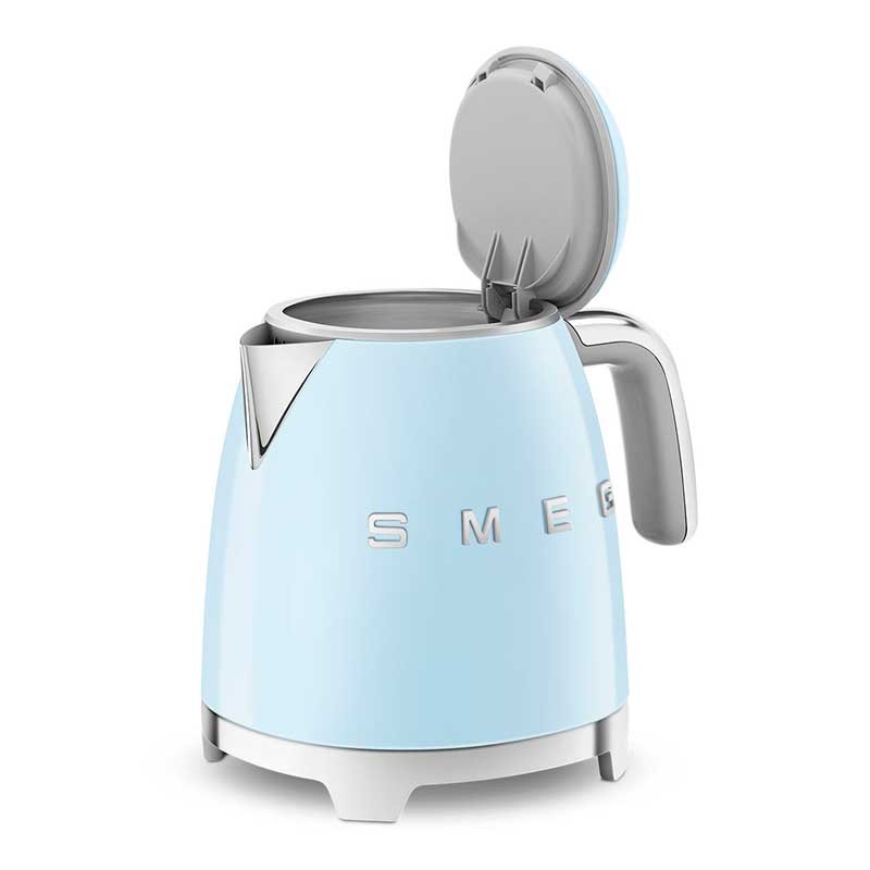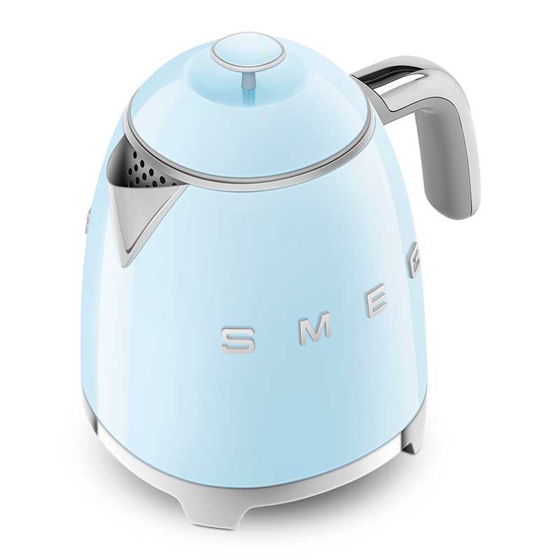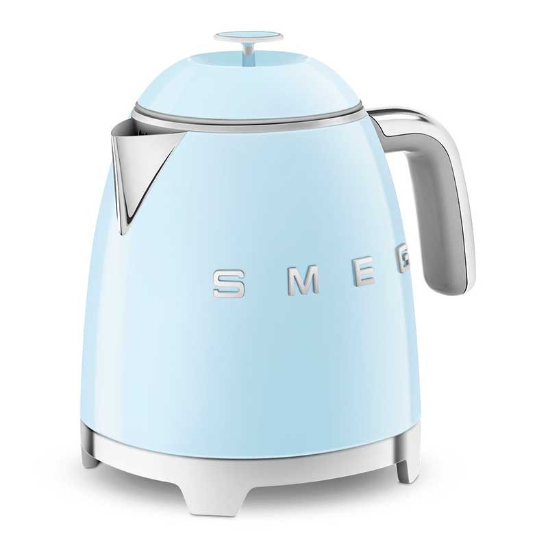 Mini bouilloire de style Smeg 50 de 0,8 litre avec corps en plastique, finition brillante bleu ciel et base pivotante à 360º.