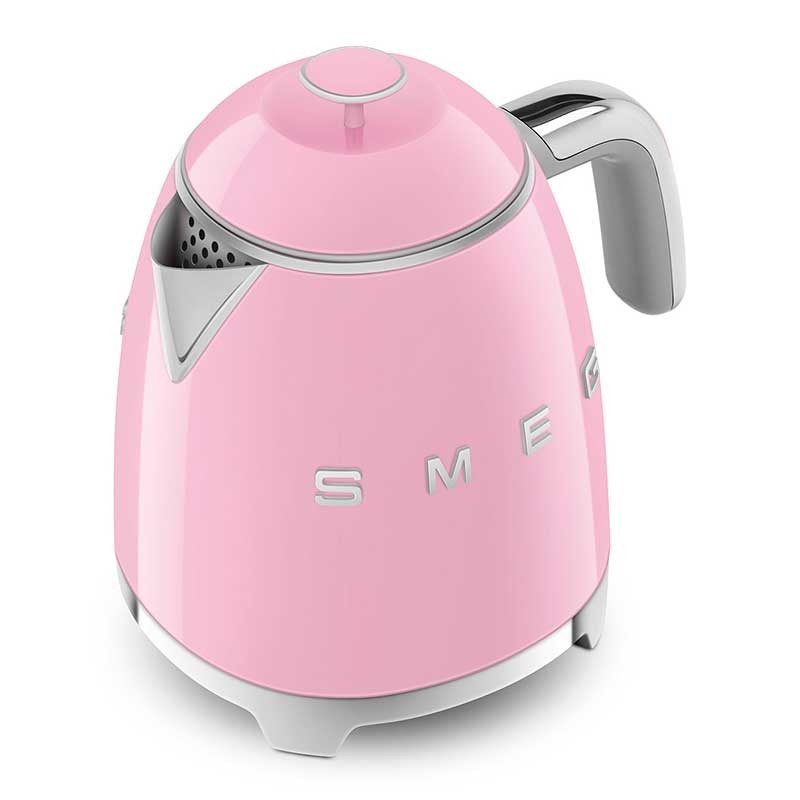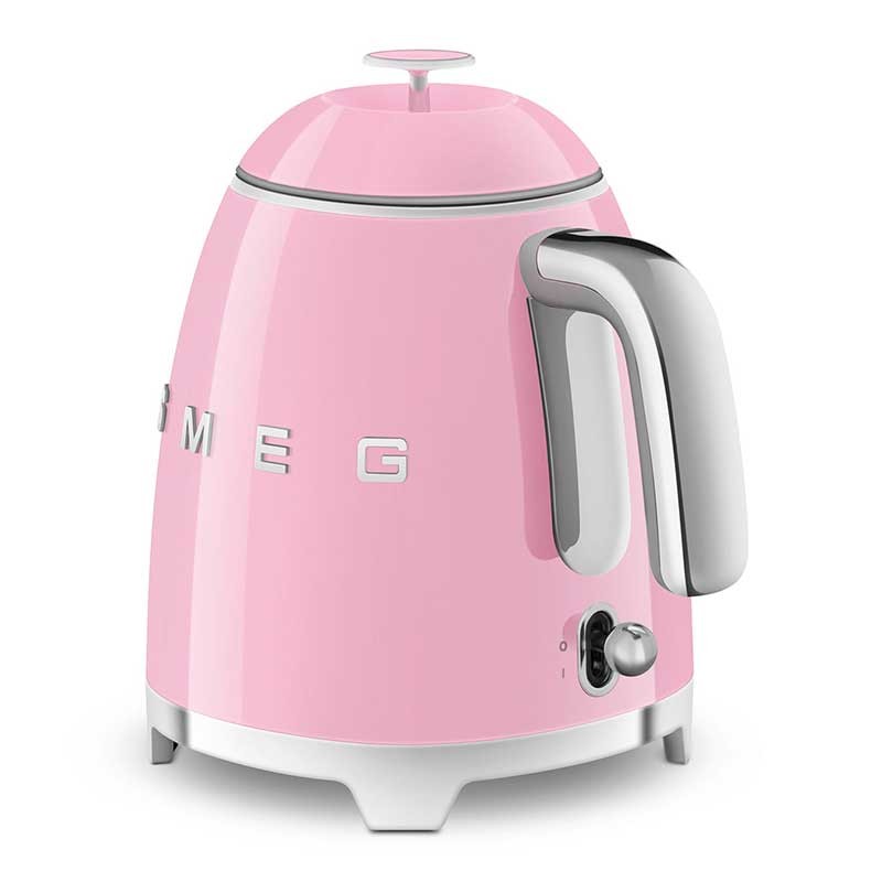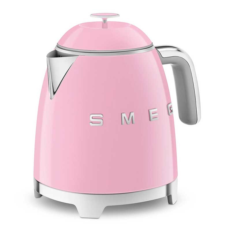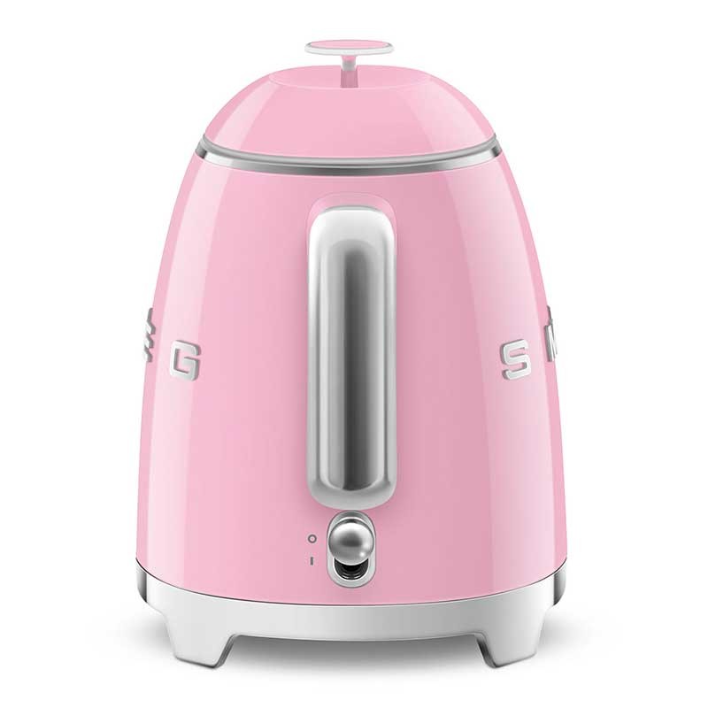 Mini bouilloire de style Smeg 50 de capacité de 0,8 litres avec corps en plastique au fini rose brillant et base pivotante à 360º.
