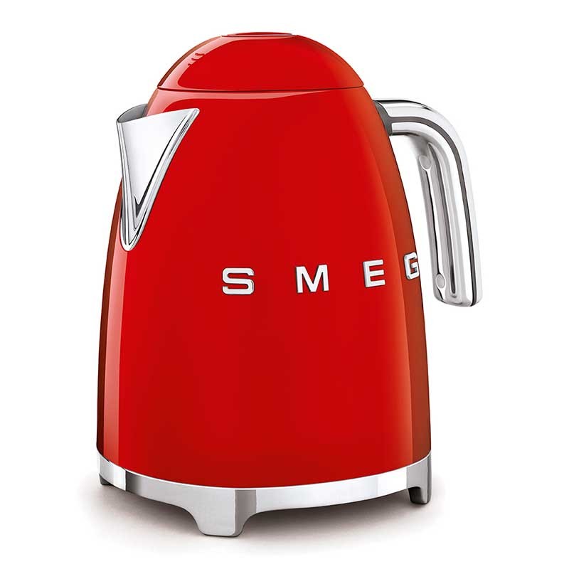 Bouilloire standard Style Smeg 50 de 1,7 litres de capacité avec corps en acier inoxydable finition rouge brillant et base pivotante à 360º.