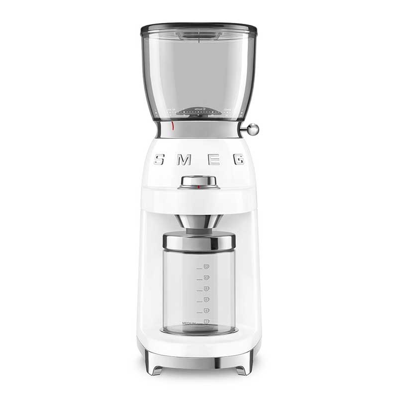 Moulin à café électrique de style Smeg 50 avec 30 niveaux de broyage de grains différents et corps en acier inoxydable finition blanc brillant.