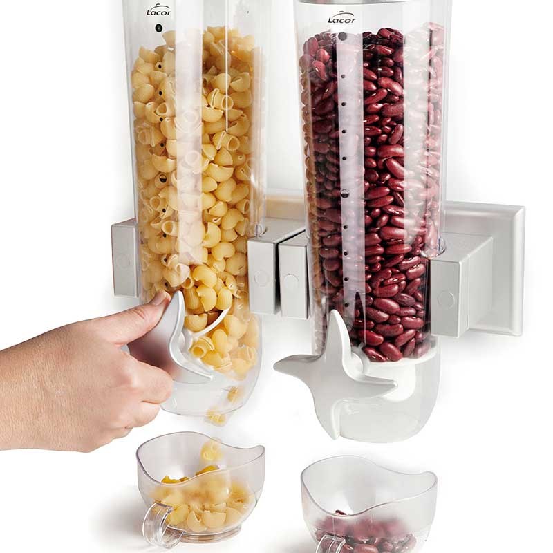 Distributeur double de céréales pour mural avec système de distributeur giratoire facile à utiliser. Idéal pour aliments tels que céréales, flocons davoine, pâtes, café, fruits secs, etc.