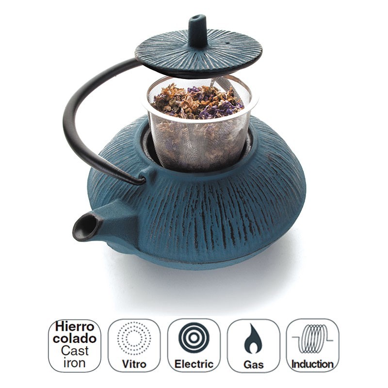Théière bleu artisanal construit en fonte, entièrement compatible avec les cuisinières à gaz, plaques de cuisson à induction, plaques vitrocéramiques ou électriques.