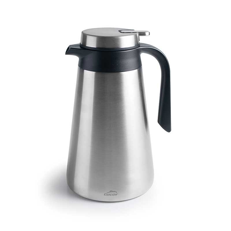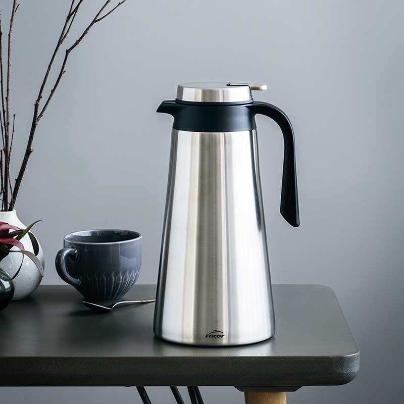 Pichet thermos avec intérieur et extérieur en acier inoxydable qui maintient les liquides chauds et froids pendant des heures.