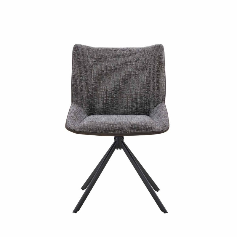 La chaise ALESSIA combine son assise et son dossier rembourrés dans un tissu texturé gris foncé avec une couche extérieure simulant du suède, offrant une texture douce et agréable au toucher.