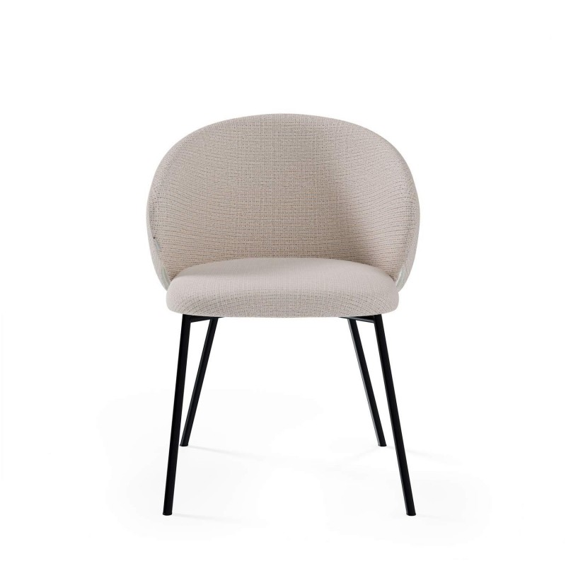 Chaise MERIDA : design vintage en tissu beige, structure enveloppante et rembourrée pour un confort maximal. Pieds métalliques noirs. Élégance et style.