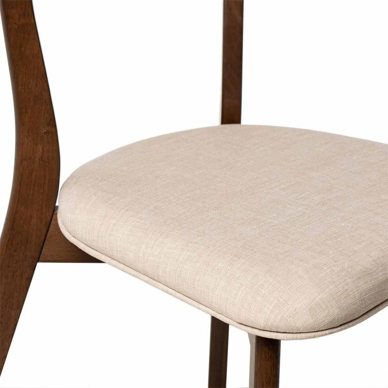 La chaise en bois ANAIS est fabriquée en placage de noyer et tapissée de tissu beige (100% polyester) sur son dossier et son assise.