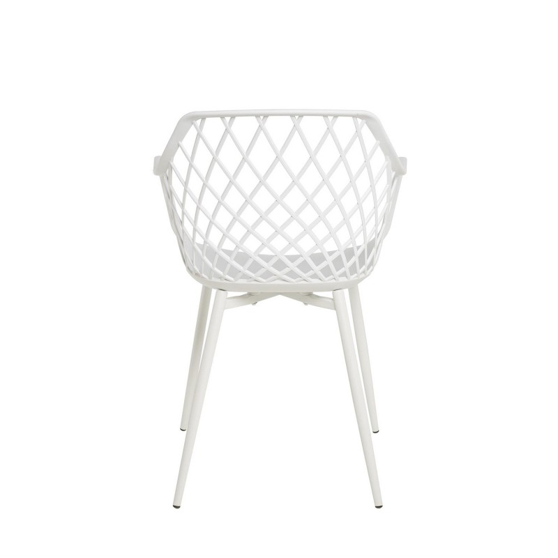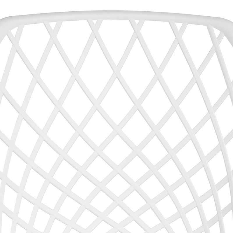 Chaise CHARLOTTE blanche: style industriel et avant-gardiste. Dossier et accoudoirs entrelacés en treillis géométrique. Polypropylène résistant et pieds en métal laqué.