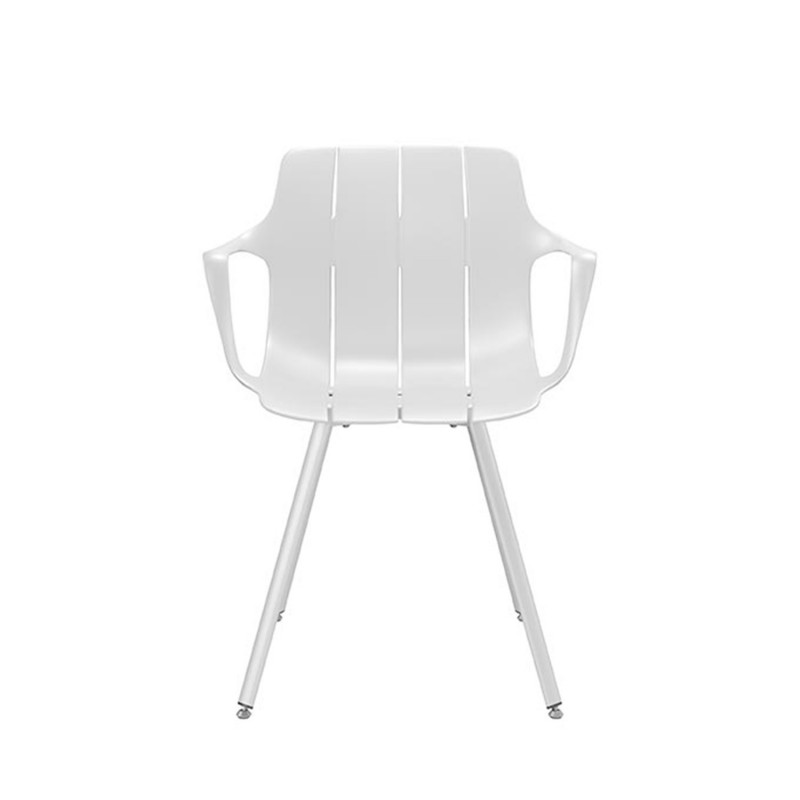 La chaise YAMAL est composée d'une assise, d'un dossier et d'accoudoirs moulés en une seule pièce de polypropylène, offrant un support ergonomique qui s'adapte parfaitement au corps.