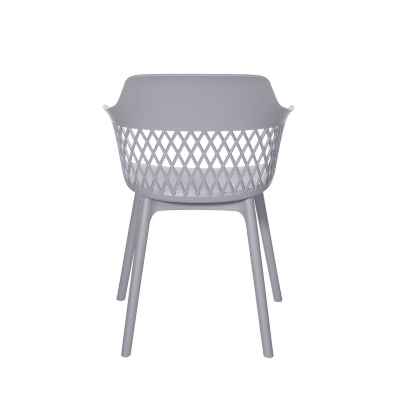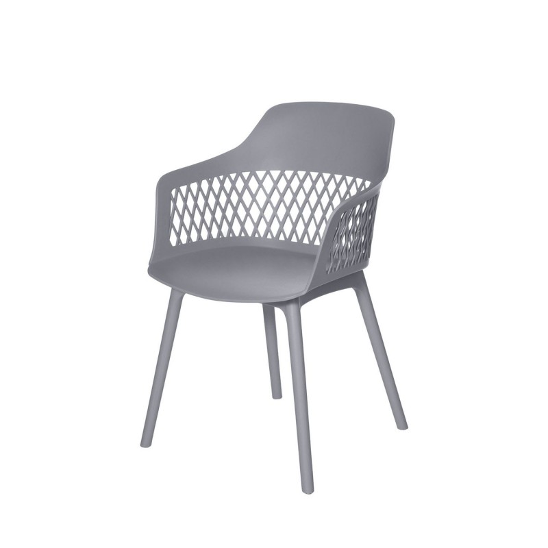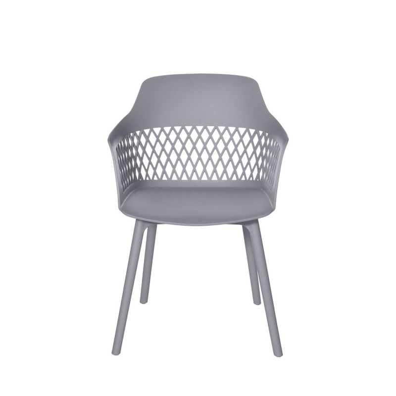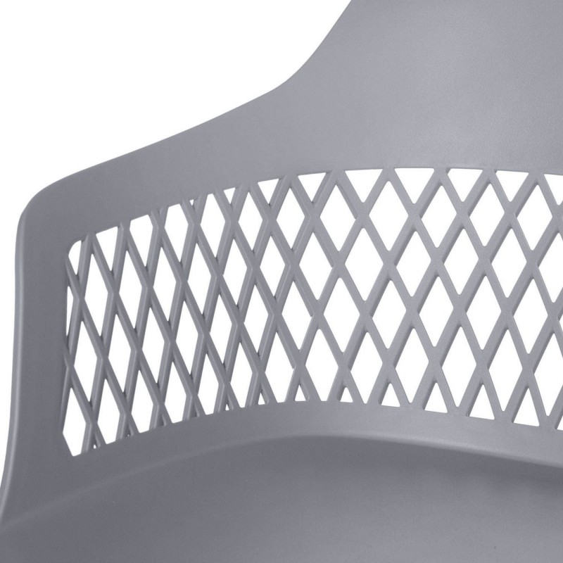 Chaise JAYDEN en gris avec dossier en treillis et design incurvé pour un soutien optimal. Fabriquée en polypropylène pour durabilité et nettoyage facile. Intemporelle et polyvalente.