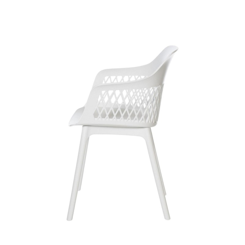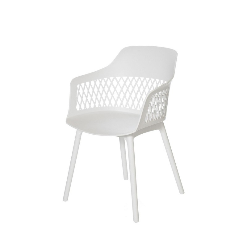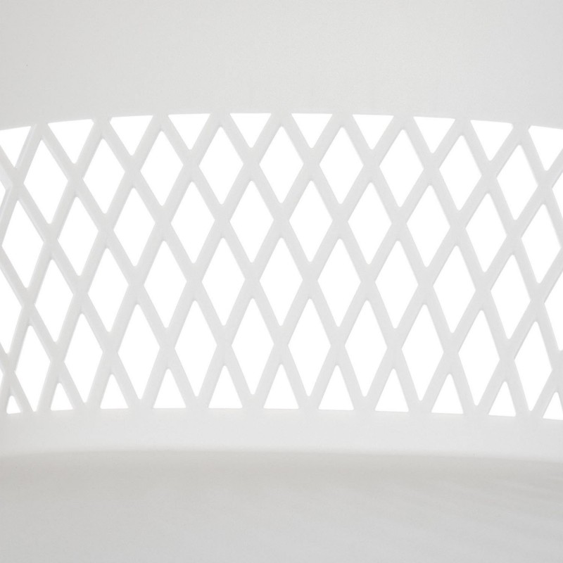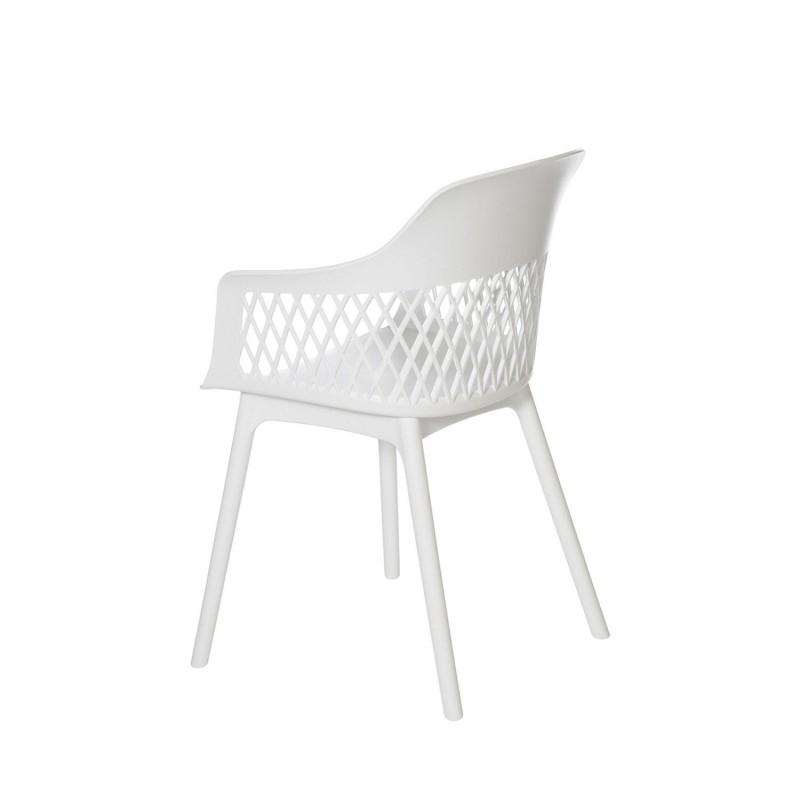 La chaise JAYDEN en blanc présente un dossier ajouré qui lui confère un aspect léger et moderne. Son design légèrement incurvé offre un soutien optimal pour le dos, garantissant confort et style dans n'importe quel espace.