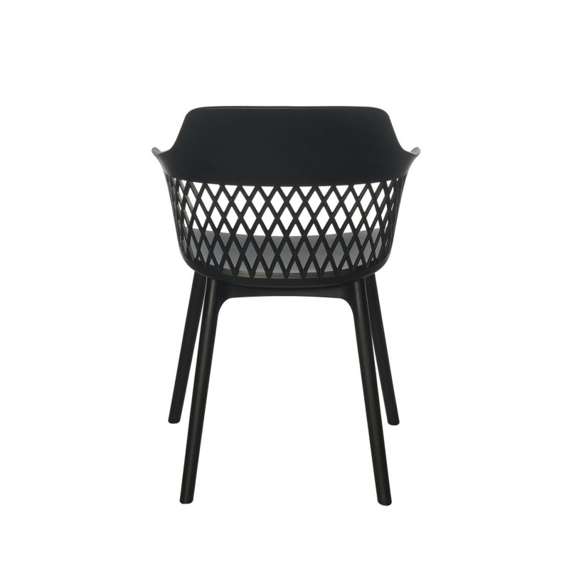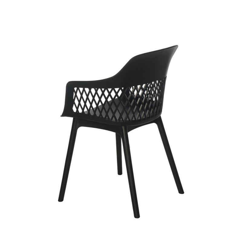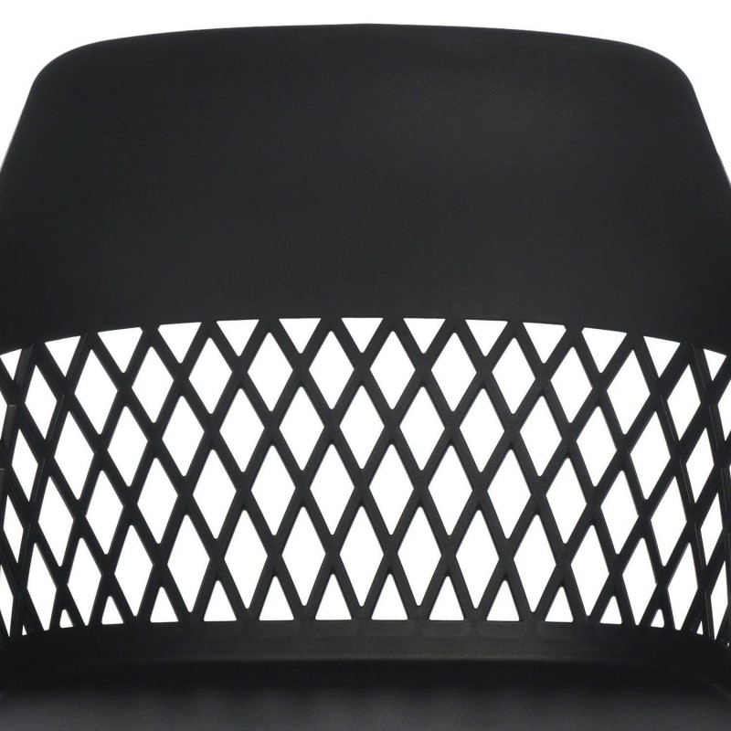 La chaise JAYDEN en noir se distingue par son dossier en treillis qui lui confère un aspect léger et moderne. Son design légèrement incurvé offre un soutien optimal pour le dos, garantissant confort.