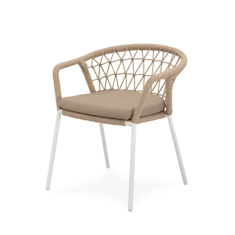 La structure de la chaise SOLENE est composée d’un tressage en corde résistant qui enveloppe délicatement le dossier et les accoudoirs, créant un effet visuel attrayant tout en offrant un soutien ergonomique. Disponible dans des tons naturels, elle s’intègre facilement sur les terrasses, dans les jardins ou patios, apportant une touche contemporaine et chaleureuse.