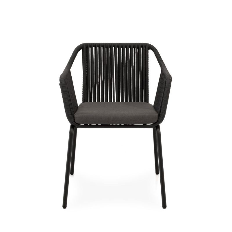 La chaise d'extérieur PENNY gris a un dossier et des accoudoirs avec une structure composée de lignes verticales de corde et également des pieds en acier spécialement traités pour résister aux intempéries.