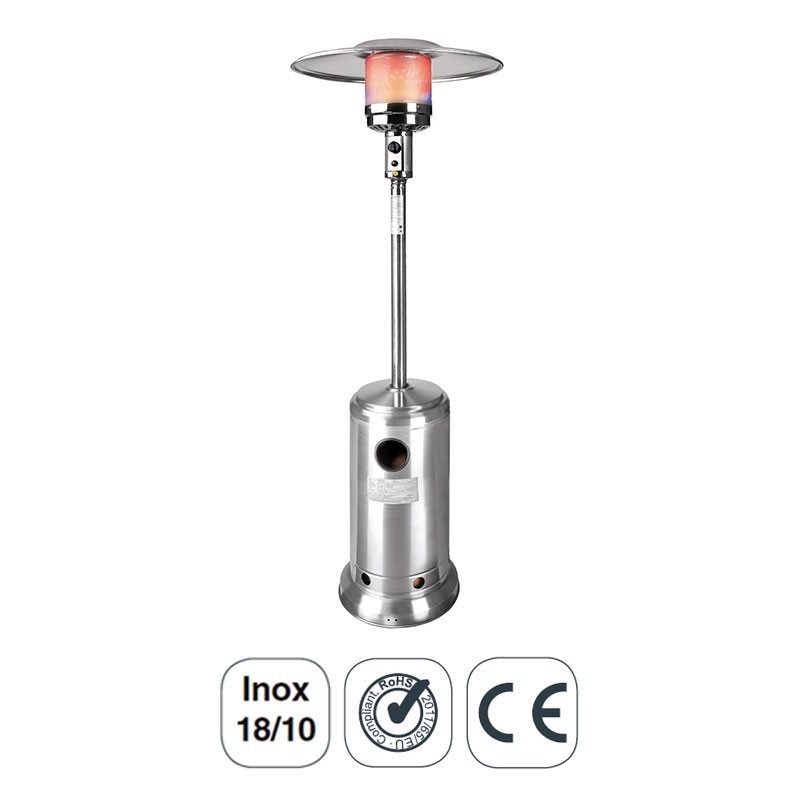 Poêle stand de gaz pour les terrasses de bars ou de restaurants. Fabriqués en acier inoxydable 18/10 avec 224 cm de hauteur et réflecteur Ø80 cm.