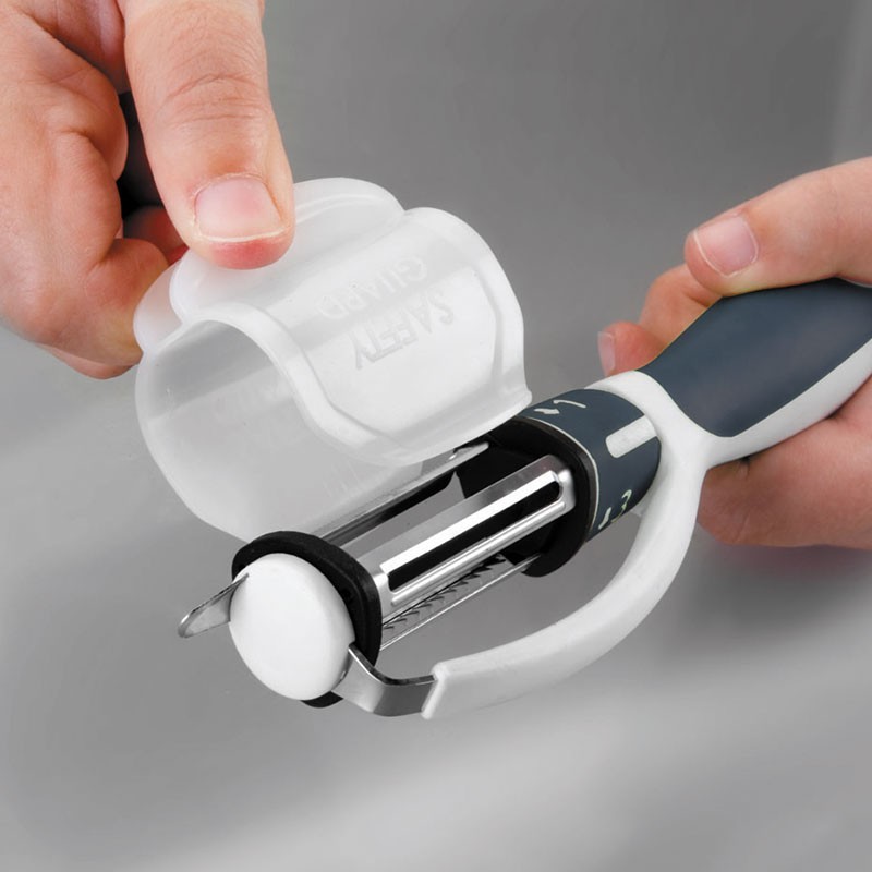 Éplucheur de type "Q" de 20 cm de long avec 3 lames rotatives en acier inoxydable 18/10 de haute qualité et résistance à la corrosion.