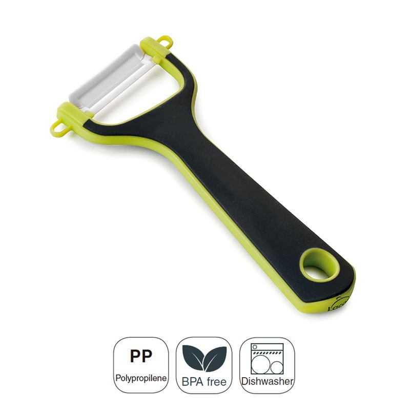 Éplucheur de type "Et" 8,5X16,5 cm de long avec poignée en polypropylène Doux au Toucher et anti-glissement de la lame en céramique qui préserve de l'oxydation des aliments.