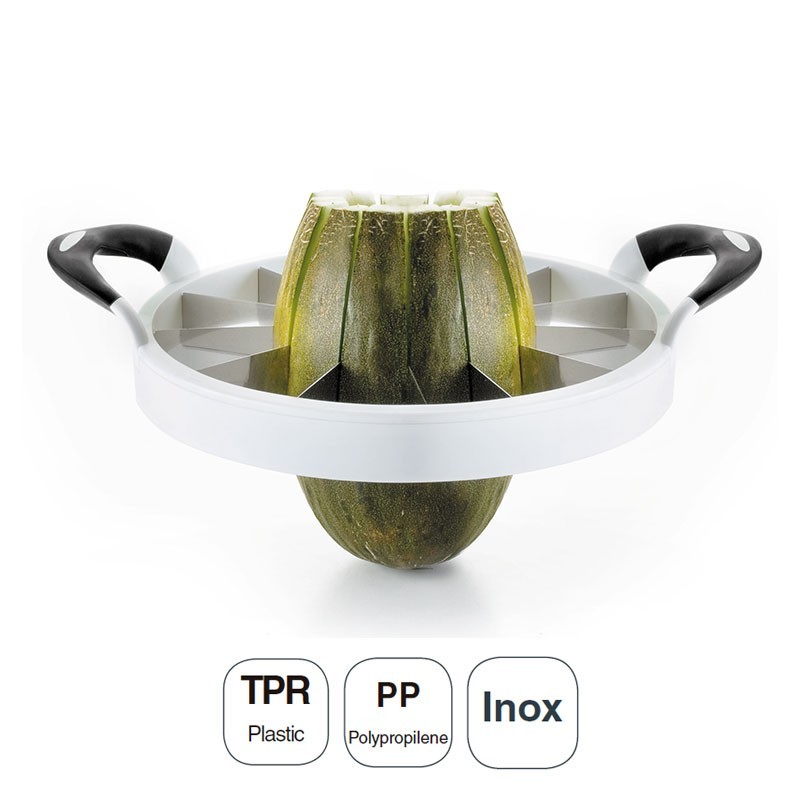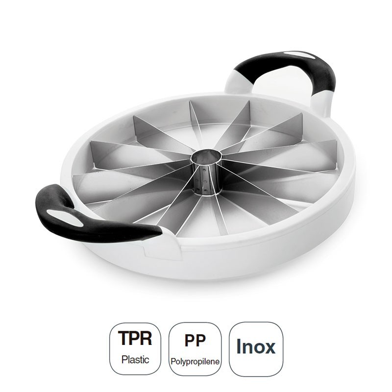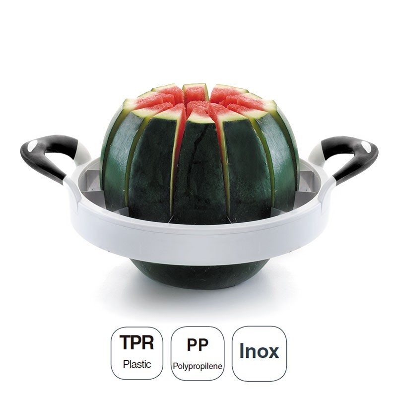 Coupe en tranches pour les melons et les pastèques fabriqués avec des lames en acier inoxydable, corps en polypropylène et poignée en plastique TPR. Mesure Ø: 28 cm.