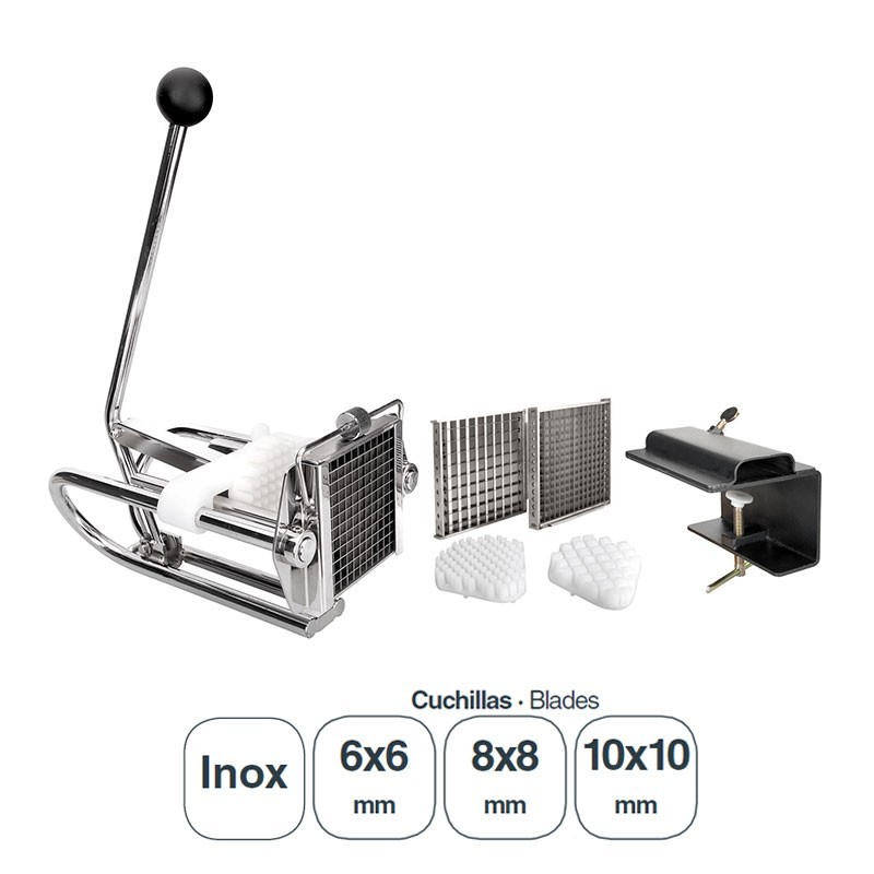 Couper les pommes de terre à puce de type professionnel avec 3 lames différentes fabriqués en acier inoxydable 18/10 de haute qualité et une excellente résistance à la corrosion.